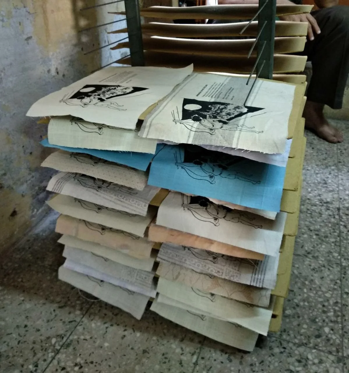 It was further printed on rag fabric that was cut to size and ironed. While the text was printed in black, the illustration was printed using another color.